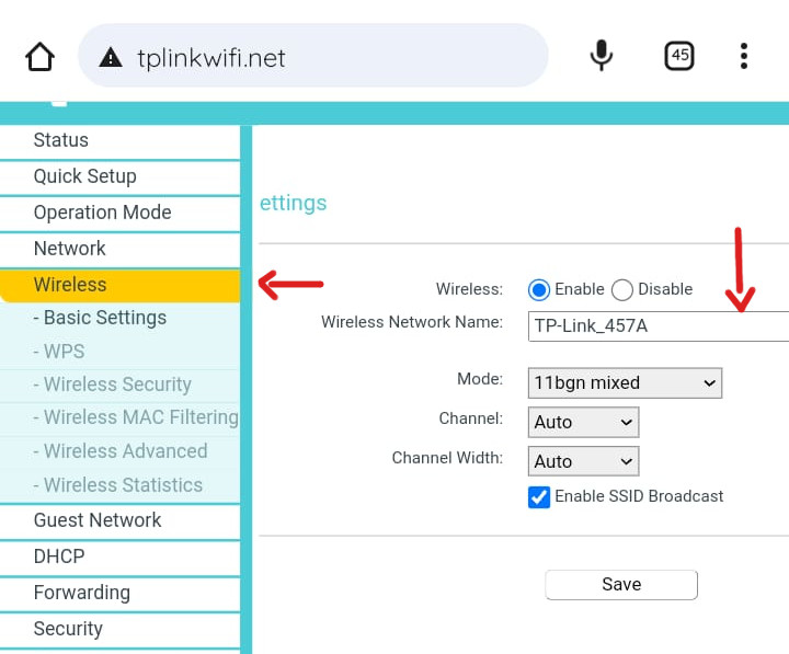 - Una vez en la configuración del router, busca la sección de Wireless, allí cambias el nombre de la red en el campo "Wireless Network Name", una vez cambiado, guardas con Save.
